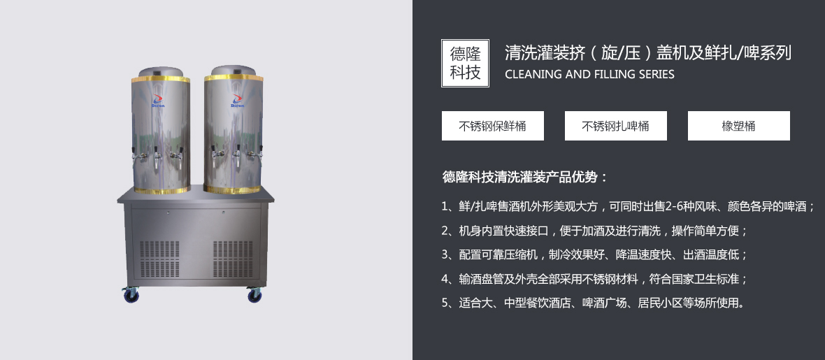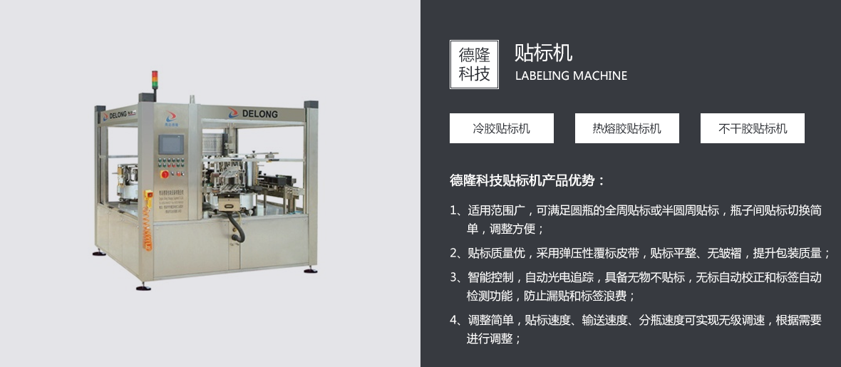 集团简介 青岛德隆自1995年创建以来,始终秉承创新与发展的优良传统,依靠技术与服务赢得客户的信赖与尊重。在贴标机向专注化、多行业领域发展并成就了中国异型瓶贴标市场的经典之后,应市场不断变化的客户需求,优化产品结构,引进吸收国内外的流体包装设备理念,在贴标机专业化地位稳固的前提下,逐步实现关联产品的多元化。 目前,青岛德隆已经成为国内能同时满足圆瓶、方瓶、扁瓶、锥度瓶、球形瓶、定位瓶等瓶型的高、中、低速多功能系列冷(热)贴标领域的厂家。随着码/卸(瓶/罐)跺机、冲瓶机、灌装挤(旋/压)盖机、全自动纸箱包箱设备、排序机、机器人码/卸垛设备、激光喷码机的运行成功,一个真正的流体包装设备方案解决专家已经成熟。 青岛德隆集团的组建,诠释了德隆的快速成长。过滤器、过滤膜(芯)、鲜(扎)啤酒清洗、灌装生产线,不锈钢鲜啤......[查看详情]